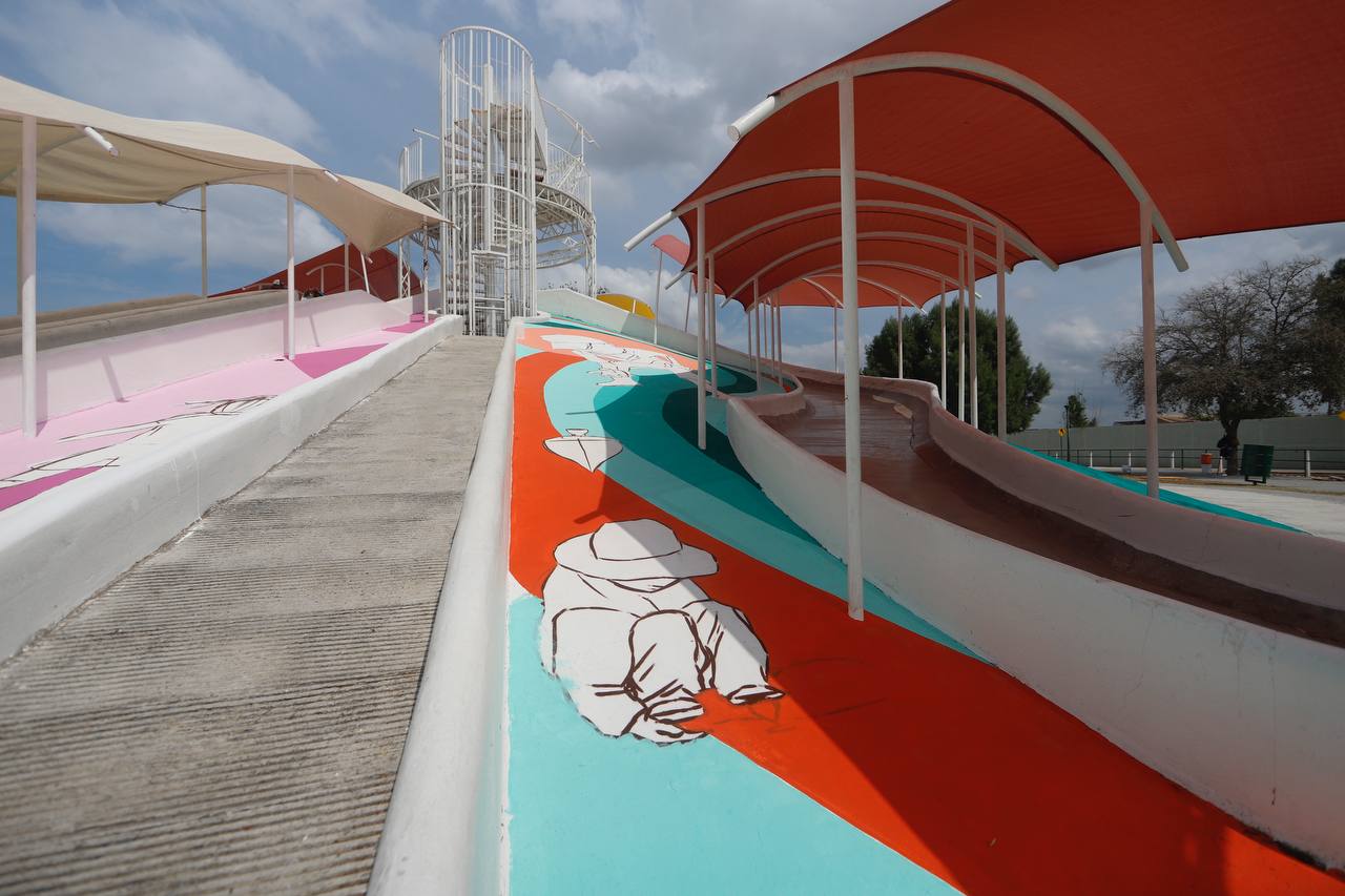 Y es que para dar una nueva imagen a los espacios de recreación,  el Gobierno Municipal, en colaboración de la Dirección de Cultura y Maquila Creativa, les encomendaron realizar un mural tipo graffiti,  en los resbaladeros tipo volcán, del Parque Viveros.